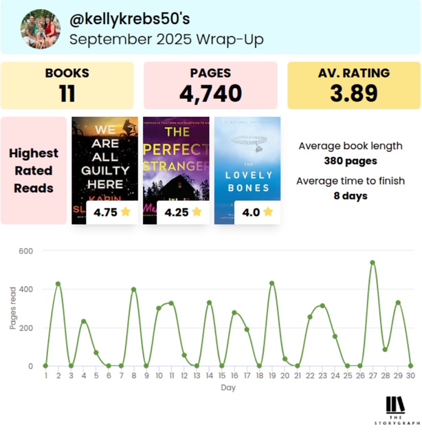 My top book of September 2025 was We are All Guilty Here by Karin Slaughter. It was a really great thriller that is twisted and will leave you guessing until the end.